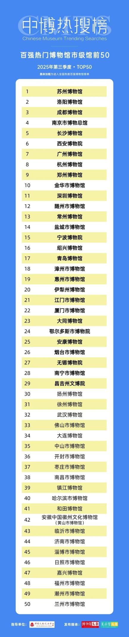 10月15日,由中国文物交流中心指导、博物馆头条统计发布的《2025年第三季度全国热门百强榜单》及延伸子榜单揭晓。随州市博物馆凭借强劲实力上榜全国市级馆百强榜,位列第十二位,成为此次榜单中的亮眼“黑马”。