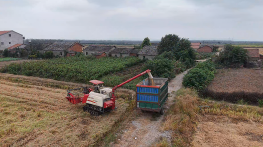 10月14日下午,村民胡贻凯的40亩中稻田里,大型收割机穿梭作业,稻谷经输送管直入运输车送往烘干厂,流程高效顺畅。“过去田块散,一户人家四五块田,收割得来回跑。”村党支部书记刘启元说,如今田块集中,收割机“一块接一块”作业,效率大幅提升。