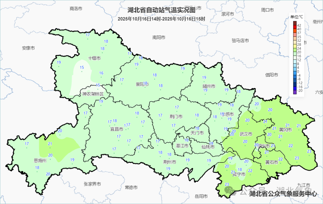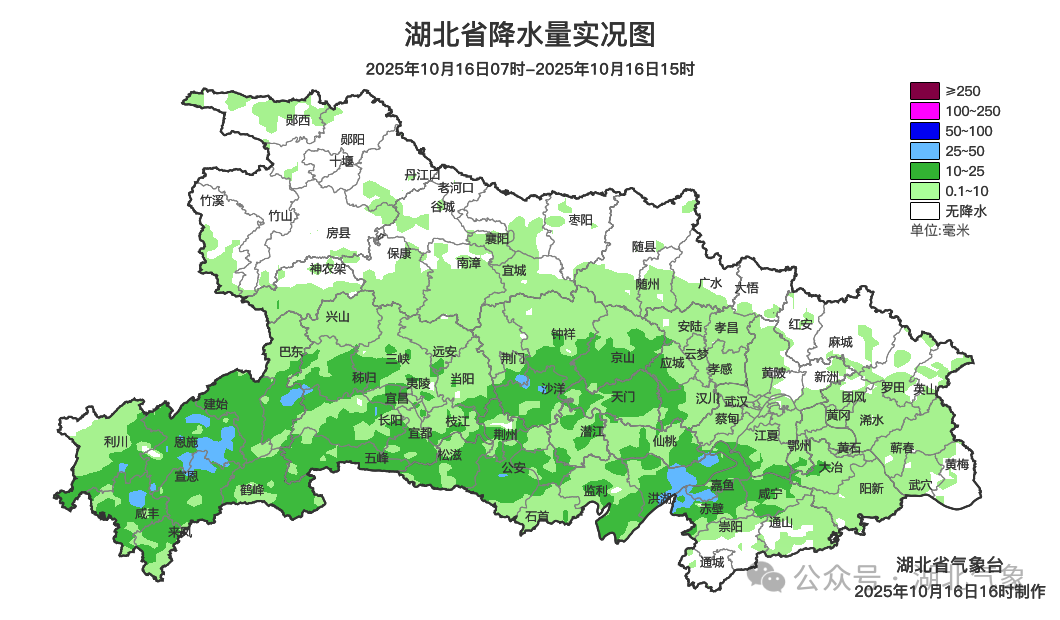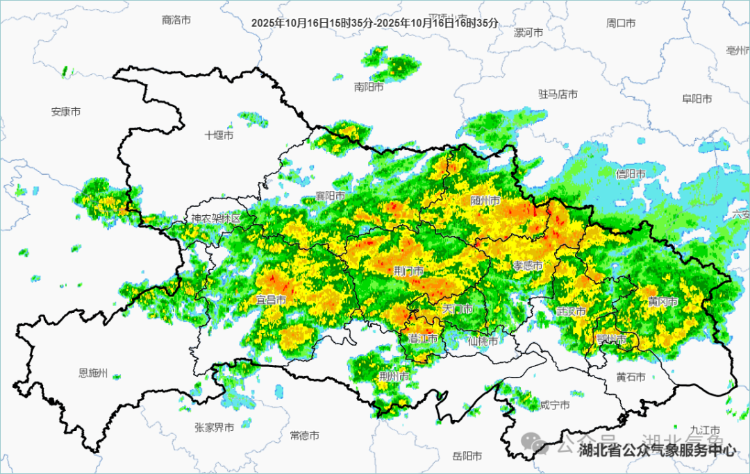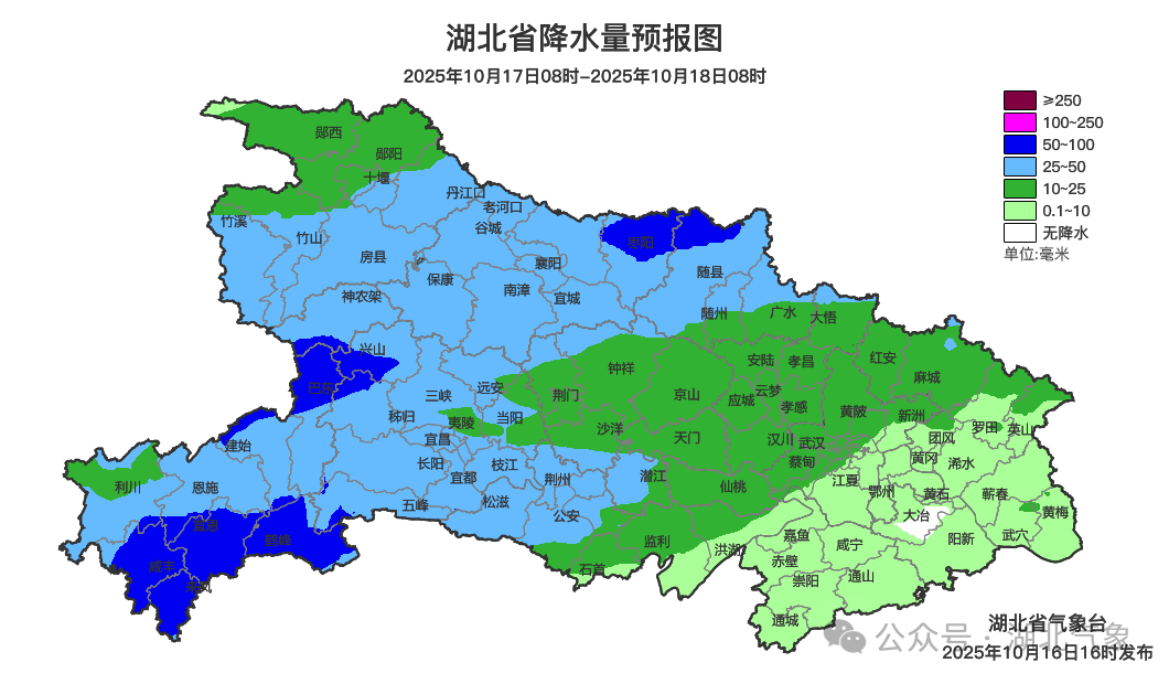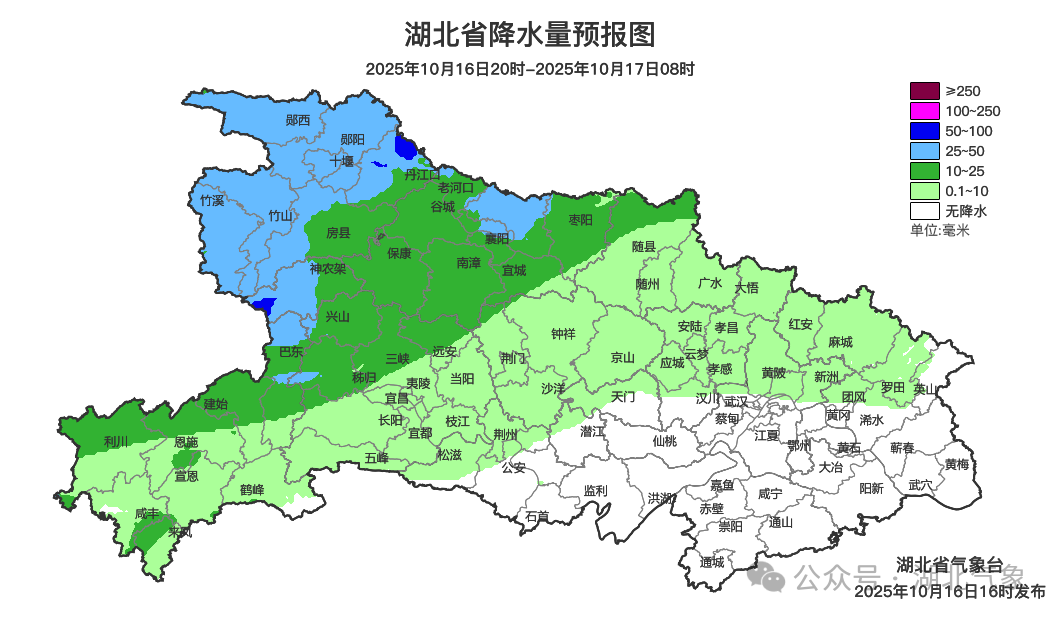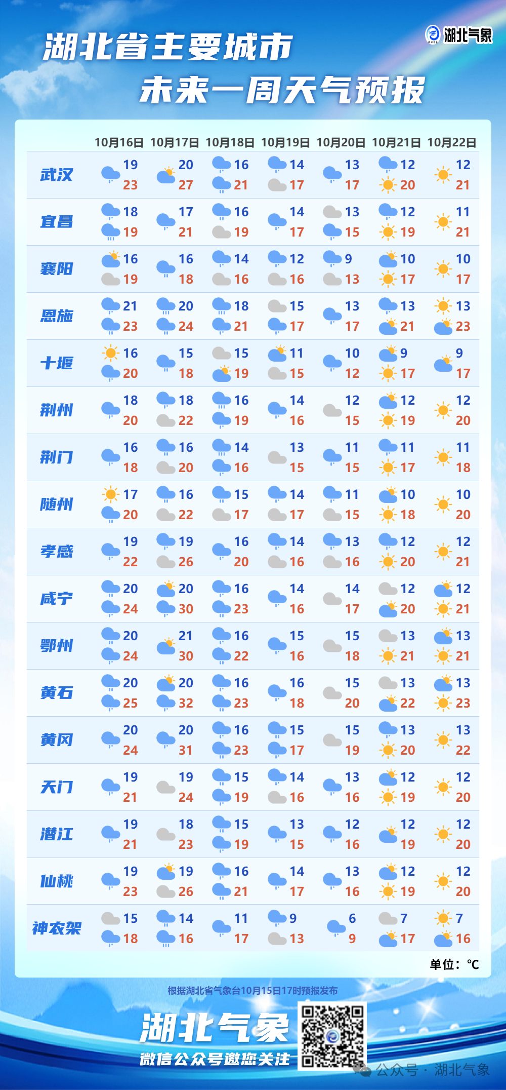 10月16日20时-17日08时,鄂西北、鄂西南北部阴天有中到大雨,局地暴雨;鄂西南南部、江汉平原北部、鄂东北阴天有小到中雨;其他地区阴天。最低气温15~20℃,偏北风2到3级、阵风4到5级。
