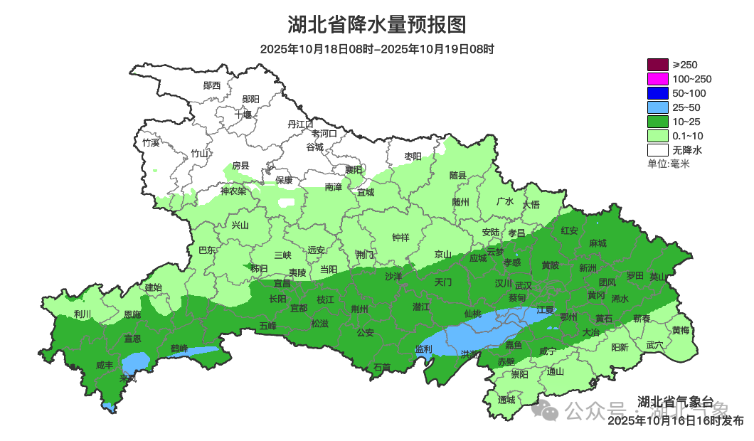 10月18日08时-19日08时,鄂西南南部、江汉平原南部、鄂东北、鄂东南阴天有小到中雨,局地大雨;其他地区阴天有短时小雨。最高气温16~19℃,最低气温10~15℃,偏北风3到4级、阵风5到8级。