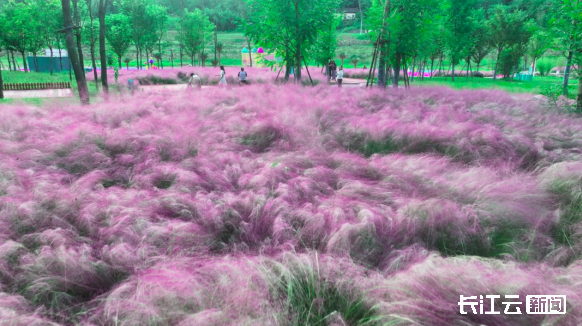 走进天河口湿地公园的粉黛花海,仿佛瞬间踏入莫奈笔下的童话世界。记者在现场看到,成片的粉黛乱子草株高近米,细长的花穗紧密缀满枝头,颜色从根部到顶端由浅及深渐变,层次分明又不失柔和,宛如一片粉色绒毯铺展在天地间,微风拂过时,粉色花浪层层叠叠、此起彼伏,时而像流动的云霞在空中飘荡,时而像柔软的棉花糖轻轻晃动,指尖轻触花蕊便会泛起“涟漪”,连空气中都弥漫着治愈的温柔气息,让人心生欢喜。
