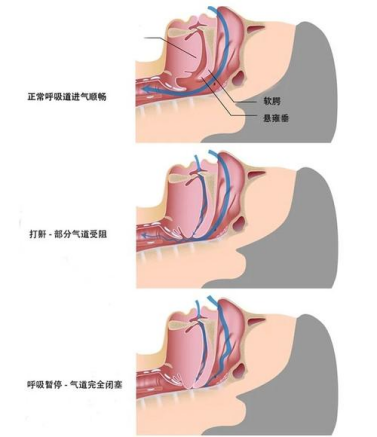 人在睡觉时,喉咙上方的肌肉会放松,气道变窄,但能保证足够的空气通过。OSA患者由于肥胖、肌肉过度松弛等原因,睡觉时喉咙上方的组织会像“塌方”一样堵住气道,导致呼吸暂停。大脑因为缺氧“难受”,迫使患者短暂醒来,重新打开气道。一夜之间,患者在鼾声如雷、突然停止、又鼾声大作之间循环,这种“窒息—憋醒”的循环要上演数十次甚至数百次,身体断断续续处于缺氧状态。