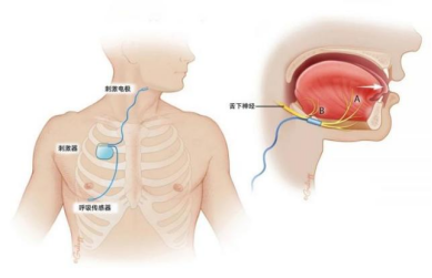 “植入式舌下神经刺激治疗技术”,通俗地说,就是舌下肌肉装上一个刺激电极,一旦安装在患者肺外部的呼吸传感器检测到患者可能憋气或呼吸暂停了,就赶紧通过刺激器给电极发信号,让电极“电”一下舌下肌肉,提醒舌下肌肉赶紧把患者的呼吸道打开。