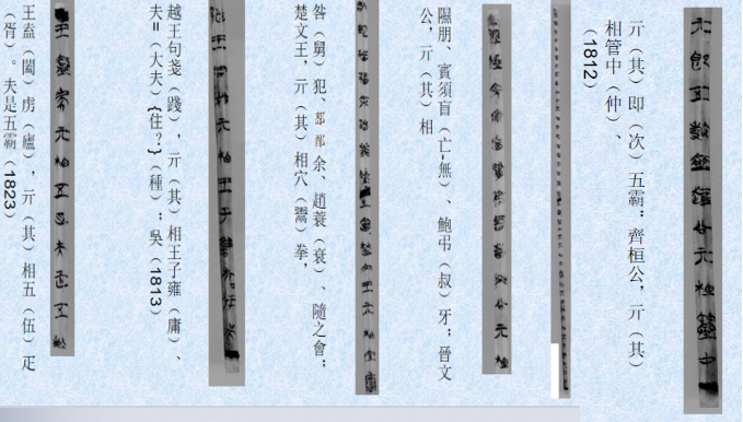 这次发布的“荆州简”之最之一,有一篇暂拟为“四王五霸”的楚简。其中在楚简里面首次写了“五霸”,也就是“春秋五霸”。它的排列是齐桓公、晋文公、楚文王、越王勾践、吴王阖庐。这是迄今考古发掘出土楚简首件“春秋五霸”,且“楚文王”首次位列其中。这是古史记载里面一种新的说法,与传统的,比如说《史记》中记载的齐桓、晋文、秦穆、宋襄、楚庄以及越王勾践、吴王阖庐有所不同。