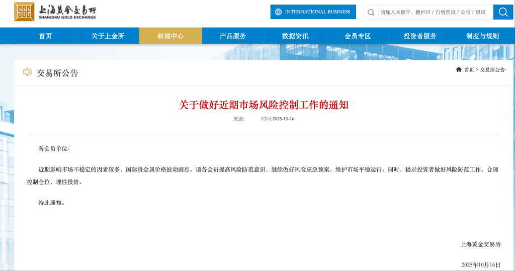 10月16日,上海黄金交易所发布《关于做好近期市场风险控制工作的通知》称,近期影响市场不稳定的因素较多,国际贵金属价格波动剧烈。同时,提示投资者做好风险防范工作,合理控制仓位,理性投资。