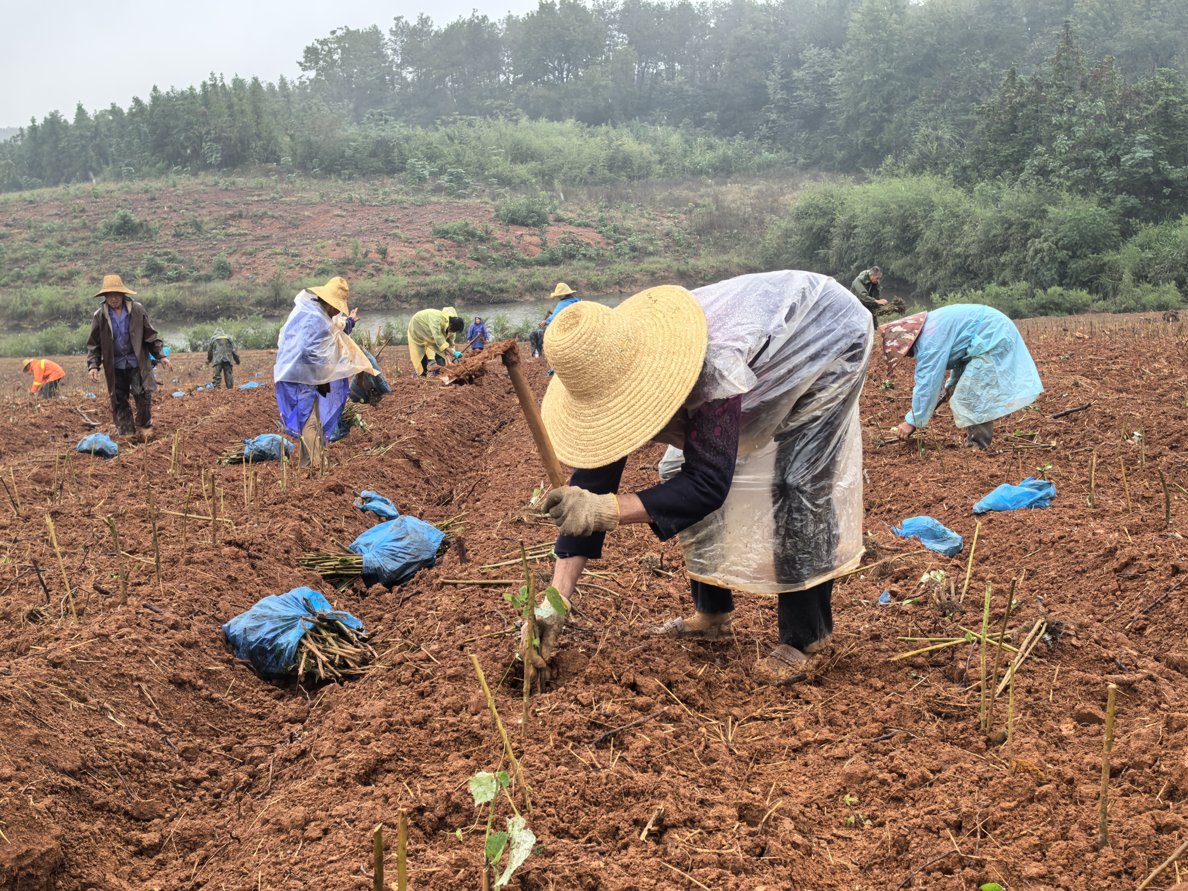 秋意渐浓,细雨蒙蒙。10月16日,湖北咸宁咸安区双溪桥镇李沛村的田间地头一片热火朝天的景象。红源苎麻种植专业合作社的乡亲们,正趁着这场“及时雨”,猫着腰,将一株株苎麻苗稳稳当当地栽进土里。