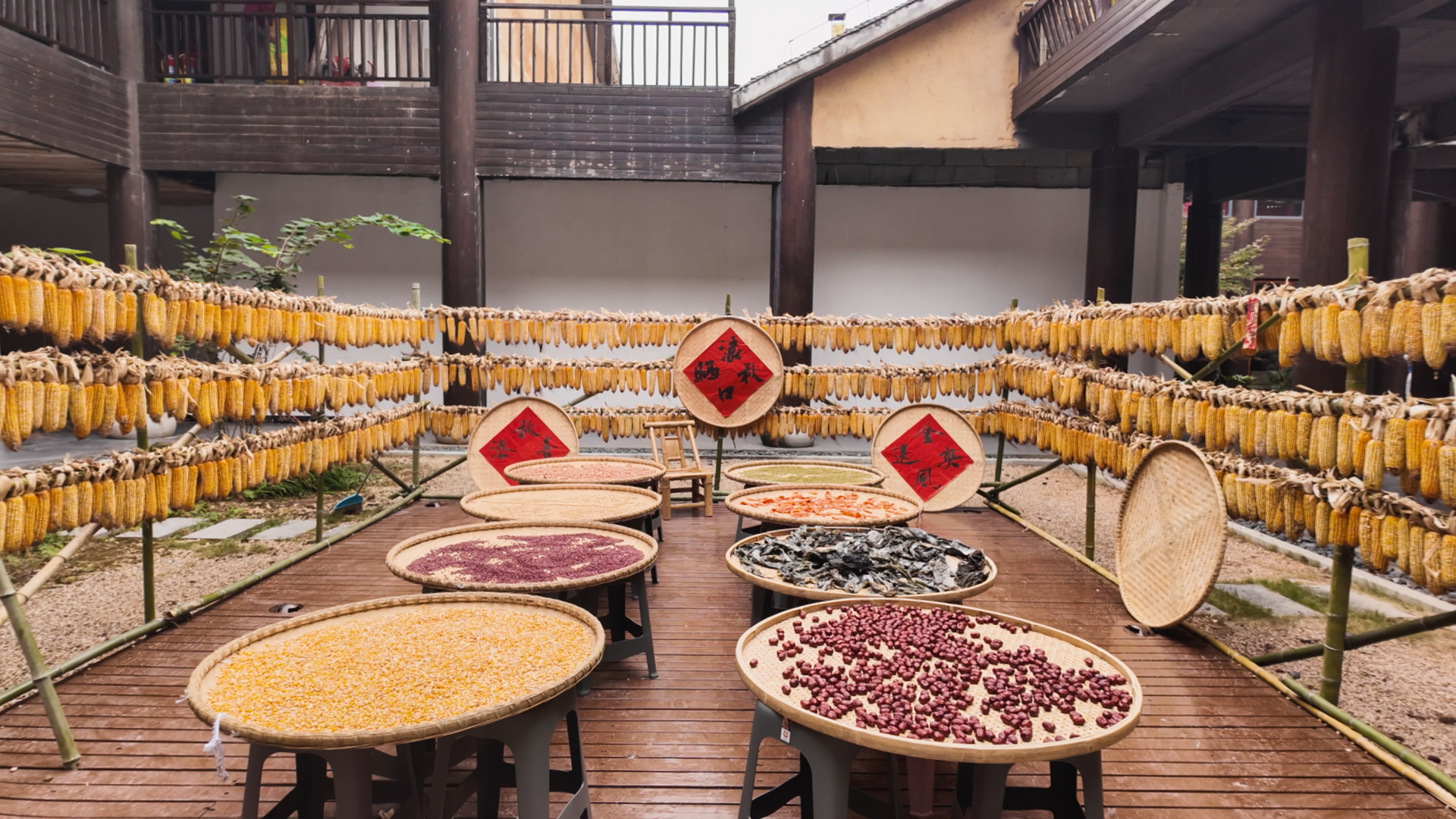 10月15日,走进该度假区喜悦酒店,庭院角落的晒秋景致格外惹眼:木质晒盘层层叠叠,搭起错落有致的“观景台”,金灿灿的玉米、红彤彤的辣椒、黄澄澄的南瓜整齐摆放,一幅生动的秋收图景跃然眼前。几位游客正举着手机,俯身、侧首,精心寻找最佳角度,将这份浓郁的秋意收入镜头。