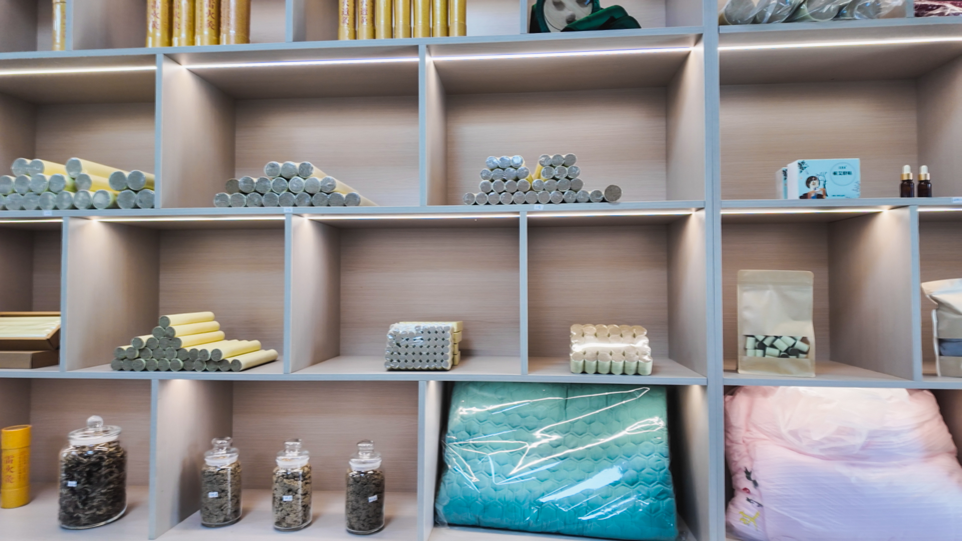 “这一组机器是生产艾产品最重要的一组设备,根据客户不同的需求,每个筛口出来的产品都是不一样的。像这个口出来的绒子,就是艾草最好的精华了,可以做艾条、被子、坐垫。”岳晓玲告诉记者。晒干的艾草经过设备加工后,筛选出不同粗细的艾绒,并通过分层筛网落入对应料仓,颗粒较粗的艾绒将用于制作香薰和饲料,颗粒适中的加工成艾草枕头。