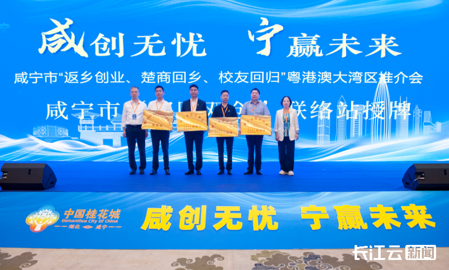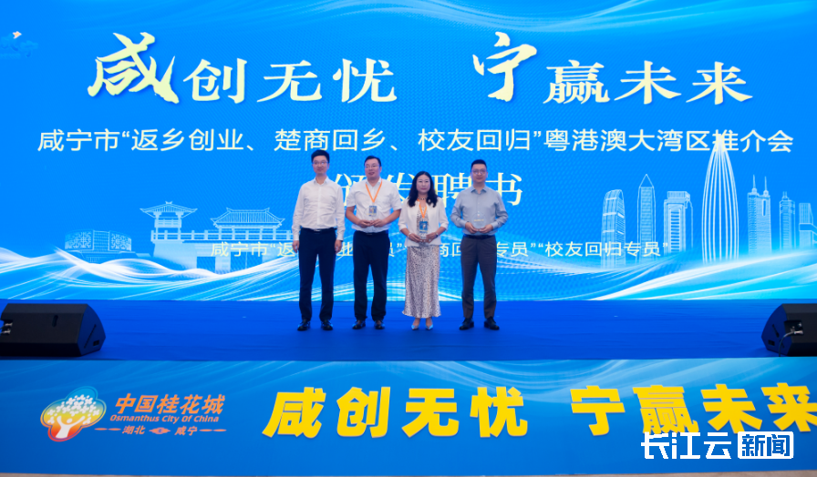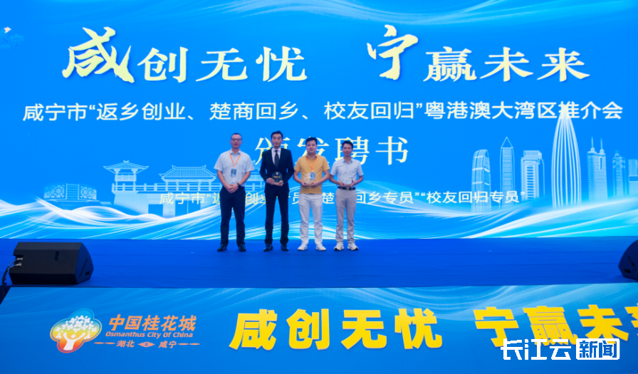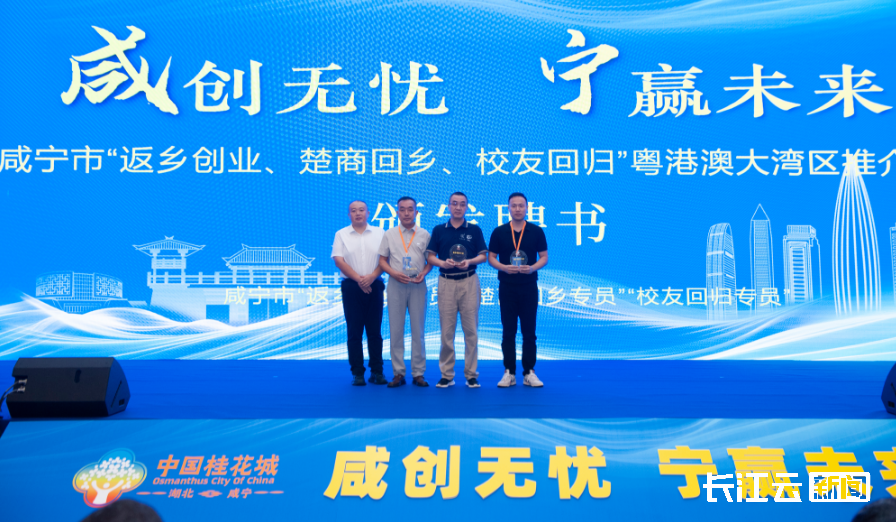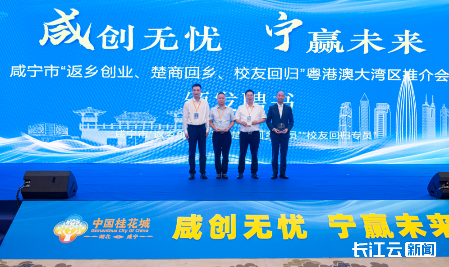 活动现场,咸宁市向大湾区楚商、企业家作“双回双创”政策推介,发出返乡创业倡议,聘任“返乡创业专员”“楚商回乡专员”“校友回归专员”,还为咸宁市“双回双创”联络站授牌。