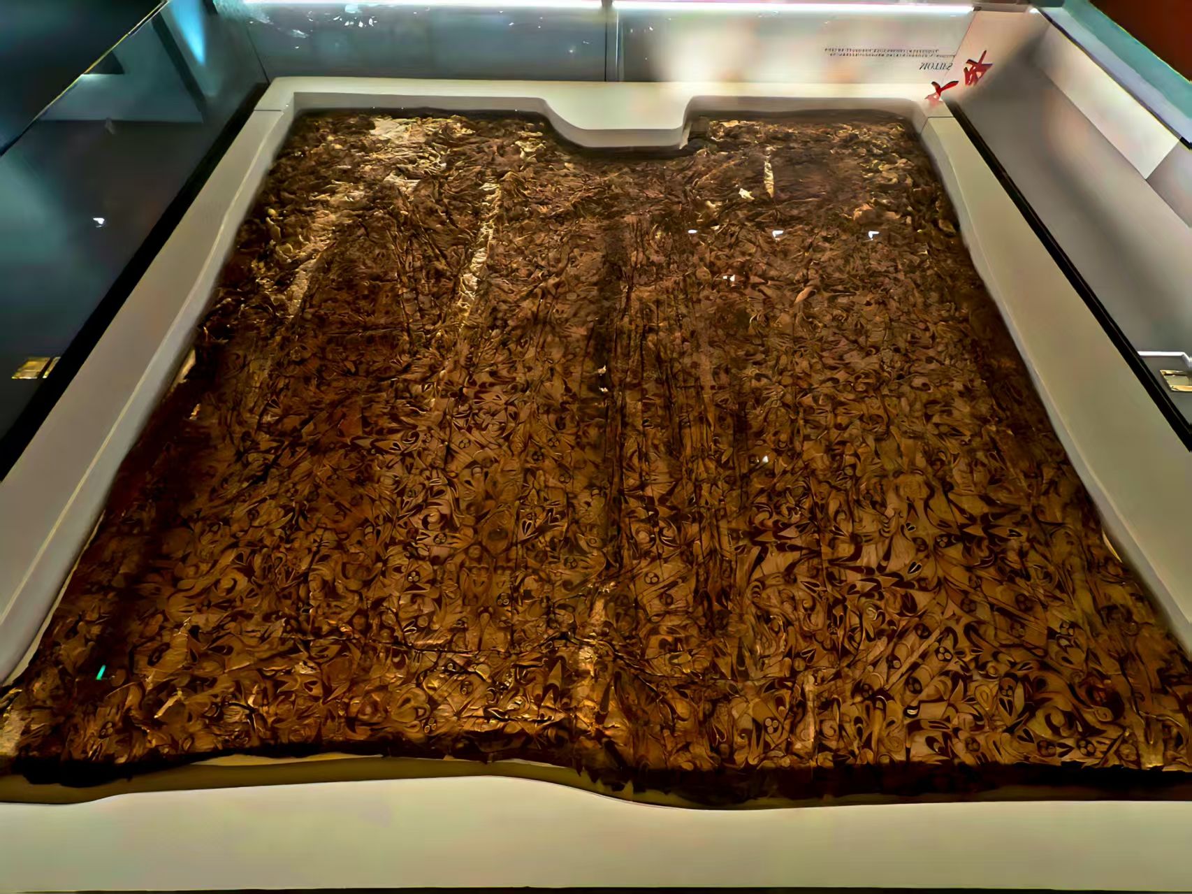 “衣绣锦缘”单元,巨大的蟠龙飞凤纹绣浅黄绢面衾,首次以文物全貌的形式亮相,同样吸引眼球。它是战国时期楚国贵族使用的“蚕丝被”,正方形,但上端中间有个凹口,正是放置头部的地方。这巧思妙想令人不得不钦佩古人的智慧。