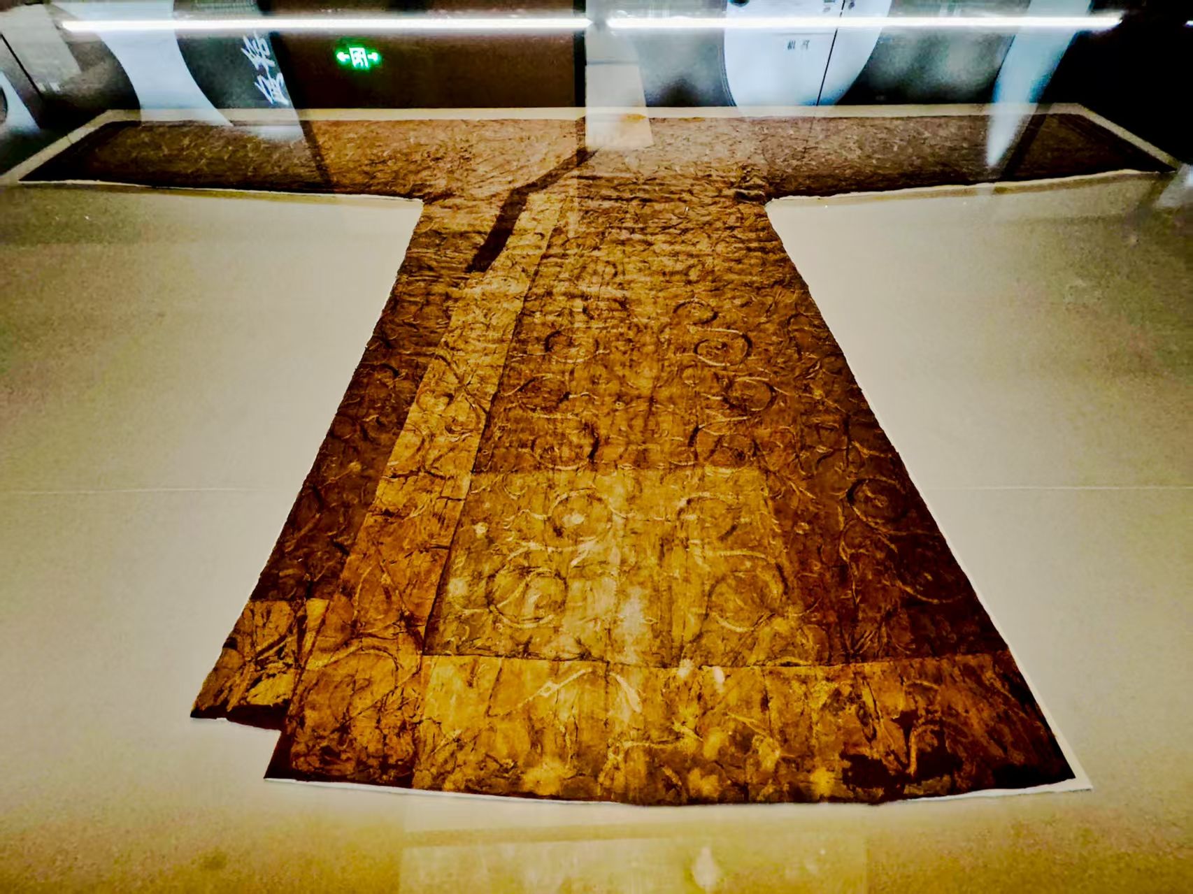 蟠龙飞凤纹绣浅黄绢面衾,湖北荆州马山一号楚墓出土。王郭骥摄。