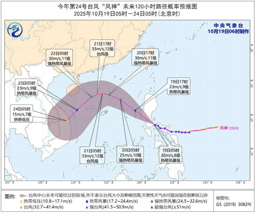大风预报:受冷空气和“风神”的共同影响,19日8时至20日8时,台湾海峡、巴士海峡、南海北部和中部、西沙群岛、中沙群岛及黄岩岛附近海域、北部湾、琼州海峡、东海西部、浙江沿海、台湾沿海、福建沿海、广东沿海、广西沿海、海南岛沿海将有6-8级大风,阵风9-10级,其中东海西部、浙江沿海、台湾海峡、台湾西部沿海、福建沿海、广东东部沿海和南海东北部的部分海域风力有9-10级,阵风11-12级。