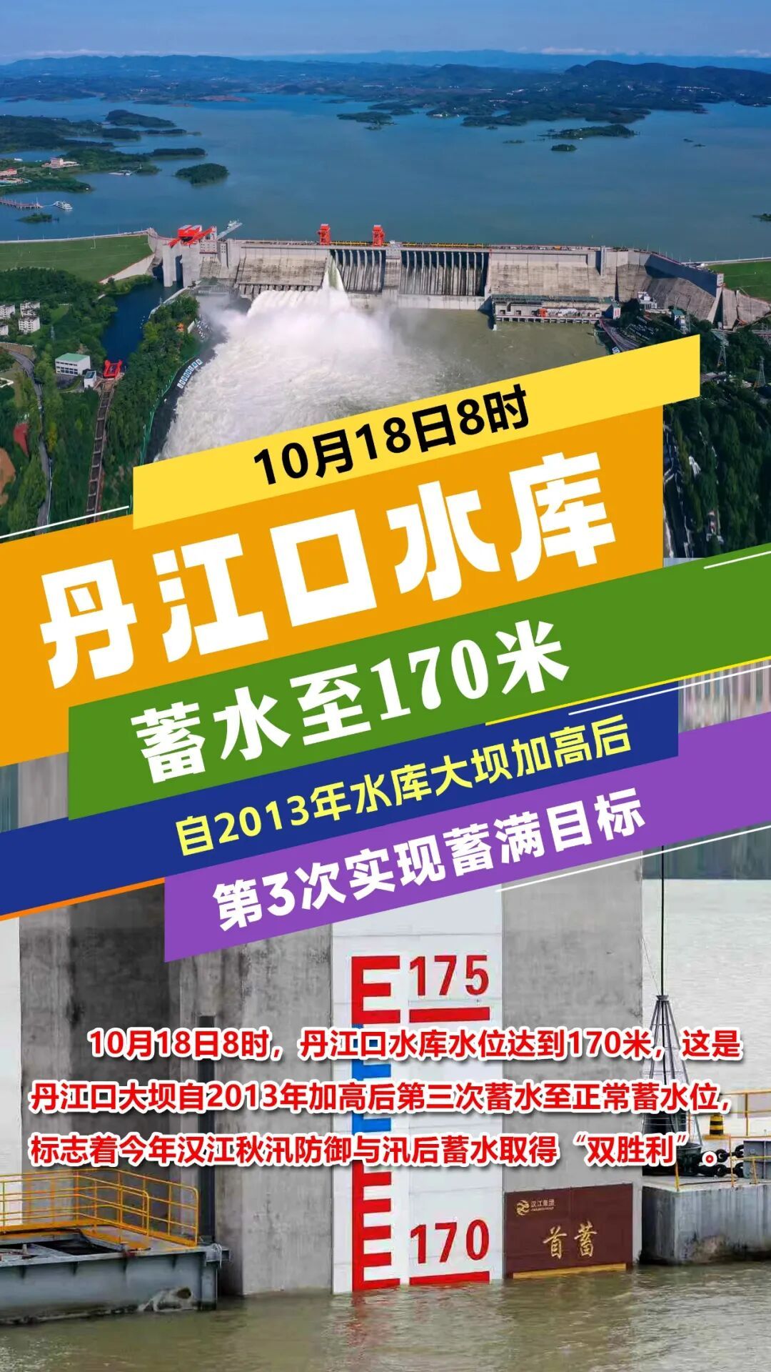 10月18日8时,十堰丹江口水库水位蓄至170米正常蓄水位,这是丹江口水库大坝加高后第三次实现蓄满目标。 目前,汉江郧阳段水位突破170米, 标志着今年汉江秋汛防御与汛后蓄水取得双胜利,为确保下一年度南水北调中线工程和汉江中下游供水安全奠定坚实基础。
