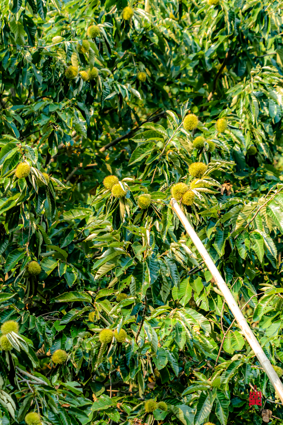 板栗树高大,果实成熟时,似“刺猬”的果实会由绿转黄,自然裂开,露出深褐油亮的内核。人们用长竿击打果实,脸上露出丰收的笑容。