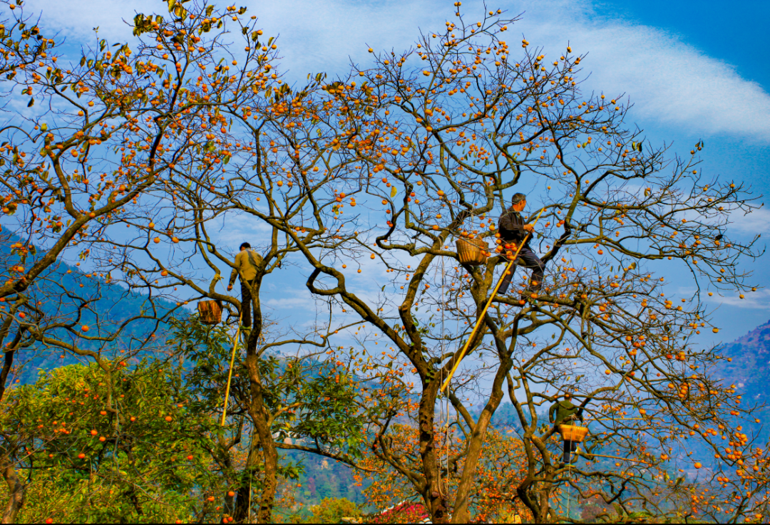 在湖北,远近闻名的罗田风味除了板栗还有这里的甜柿。山清水秀、气候温润的罗田昼夜温差较大,有利于糖分的积累,满树色艳饱满的果子,装点了罗田的整个秋天。
