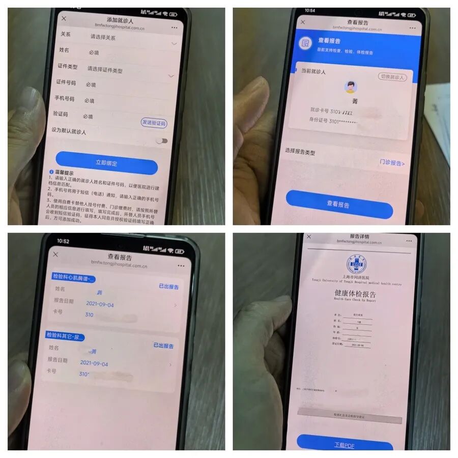 通过填入姓名和身份证号,记者顺利添加了他人为就诊人,并在页面显示为“已认证”状态,且系统自动关联了该身份证此前就诊时使用的医院就诊卡。“实名认证的用户可查看历史线上就诊记录”,随后,记者顺利查看到了被添加者于2021年在同济医院所做的多项检查的报告以及2021年9月的全套体检报告,并且还可下载PDF文件。
