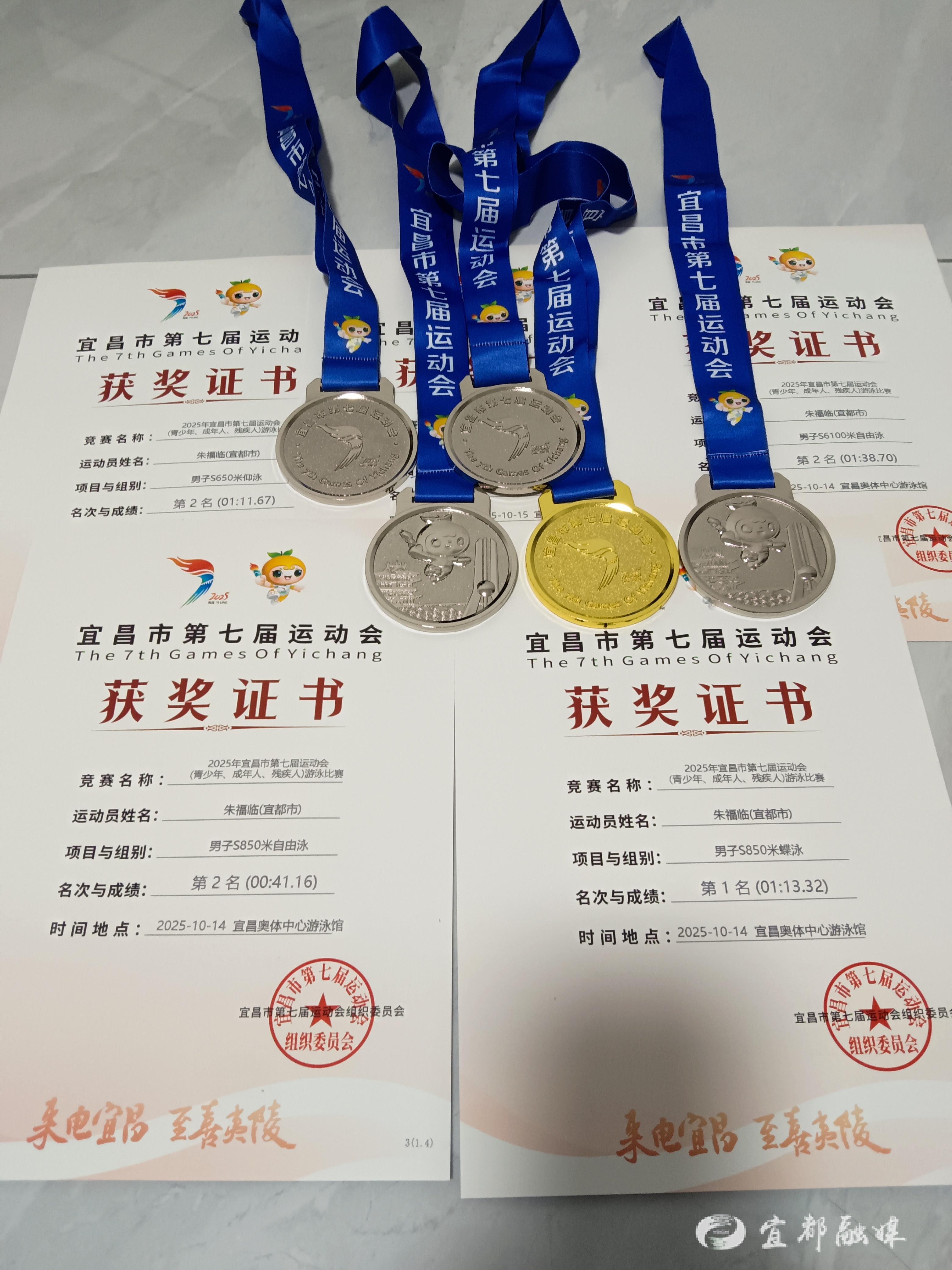 10月14日,湖北省宜都市高坝洲镇平安建设办公室(禁毒)职工朱福临代表宜都市参加宜昌市第七届残运会,获得游泳项目1金4银的好成绩,用奋斗书写了“命运以痛吻我,我却报之以歌”的生命答卷。