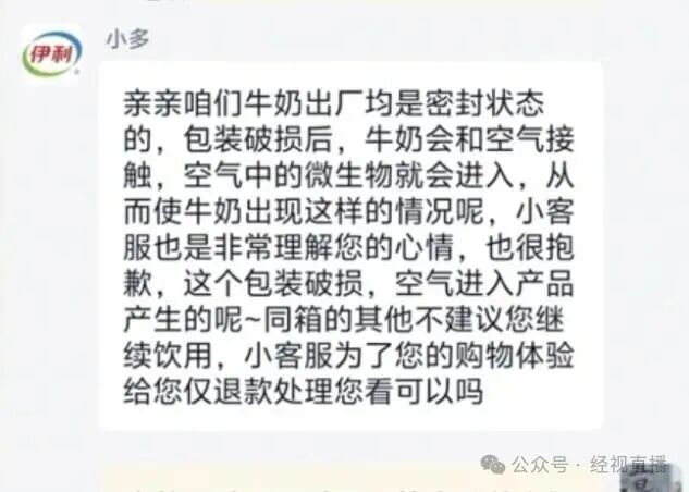 10月20日,经视直播记者分别联系天猫伊利旗舰店及内蒙古伊利总公司客服。双方均表示已记录情况,将转交相关部门处理。伊利客服称,不排除物流过程中牛奶包装漏气导致变质,并建议提供病历等证明材料。