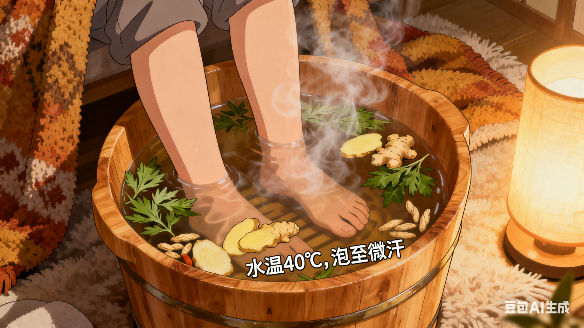 秋季泡脚:用艾叶10g、生姜5g、麦冬5g 煮水泡脚,水温40℃左右,泡至微微出汗,既能温肾散寒,又能滋阴防燥,避免秋季泡脚上火,还能改善因寒气导致的关节僵硬。