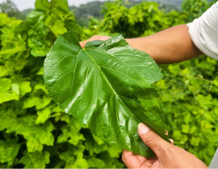 走进阳新县马羊寨生态种养殖合作社的基地,记者立刻被漫山遍野的桑树吸引,合作社理事长陈迪树随手托起了一片巴掌大的桑叶,脉络清晰、质地厚实,现在这是他眼中的“致富神器”。