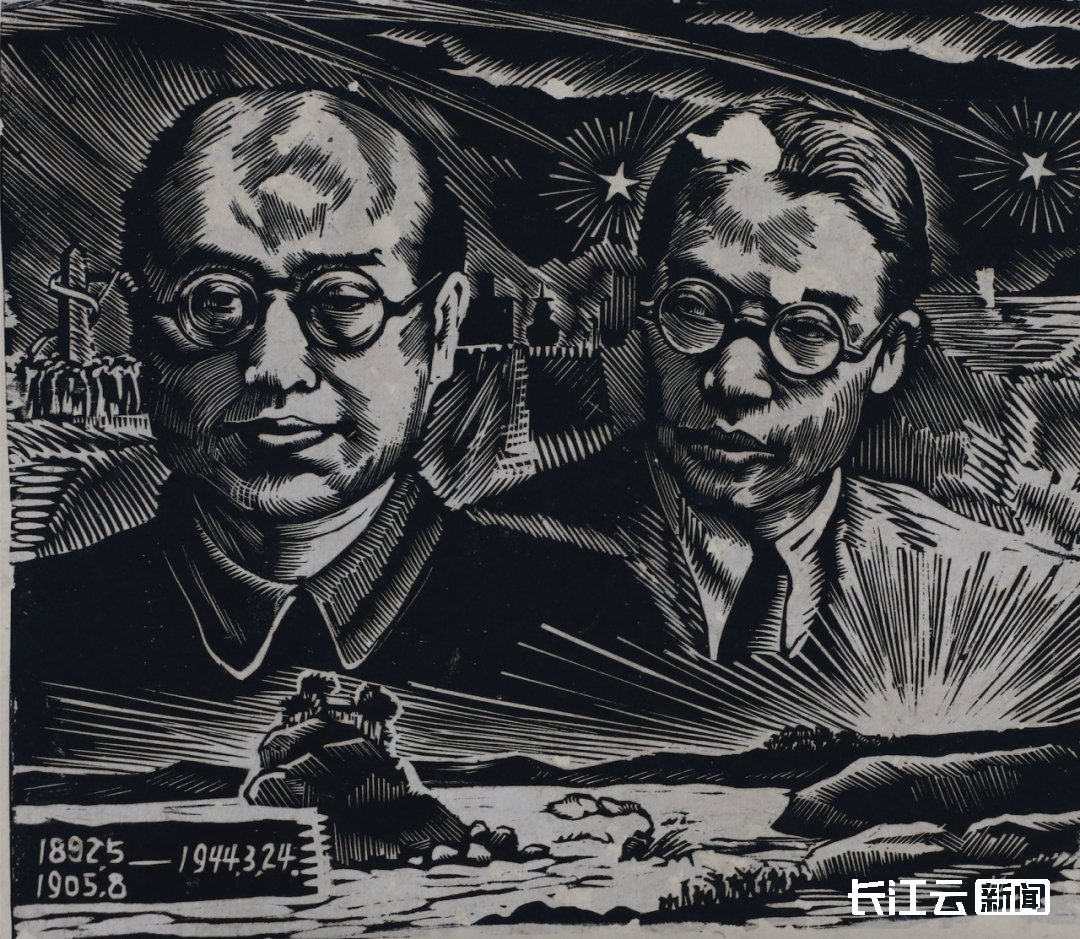 李家桢《唐氏二兄弟——罹难的武昌艺专校长唐义精、教授唐一禾》木刻版画 24.3cm×27.5cm 1944年 湖北美术学院藏