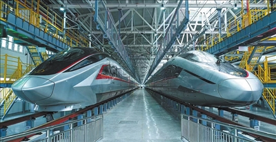 图为两列CR450动车组样车停靠在湖北宜昌动车所。唐莹摄(人民视觉)