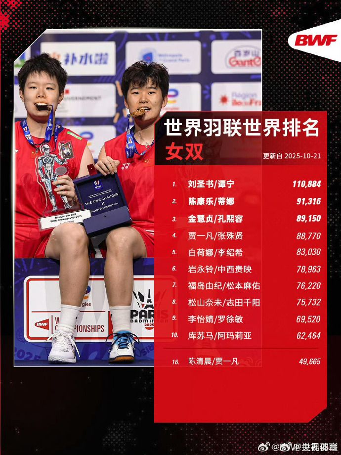 世界羽联2025年第43周世界排名揭晓,中国队强势包揽三项世界第一:石宇奇(男单)、刘圣书/谭宁(女双)、蒋振邦/魏雅欣(混双)均以10万+高分继续领跑各单项第一。