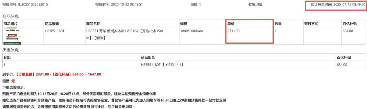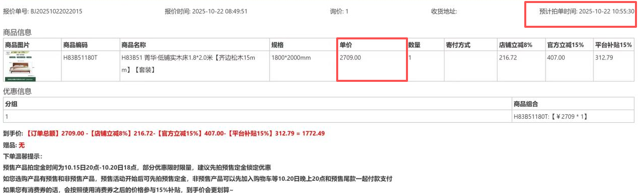 10月22日,长江云新闻记者针对源氏木语家居旗舰店的胡桃色低辅实木斜靠窗H83B51展开问询,商家提供的报价单显示,同一款商品今年7月的单价为2331元,而到“双11”促销期的10月22日,其标注单价已涨至2709元,差价达378元。