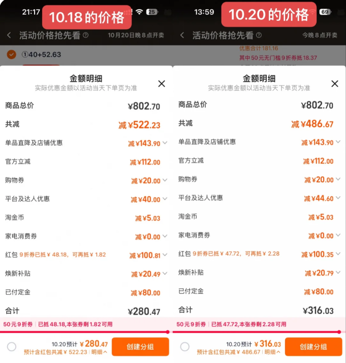 更离谱的是,有消费者晒出购物明细,单品直降、店铺优惠、官方立减、购物券、红包等“优惠buff”叠满后,最终付款价仍比原价贵了近36元。