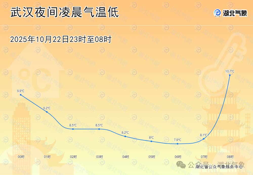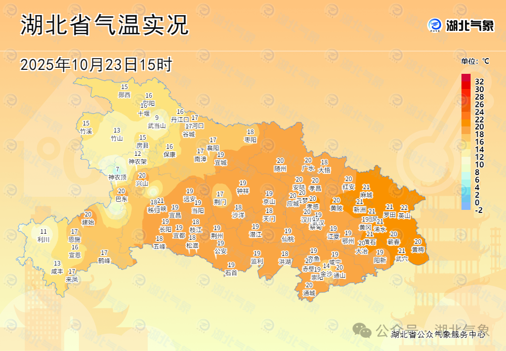 10月25日08时-26日08时,鄂西北、鄂西南、江汉平原北部、鄂东北西部小雨转多云;其他地区阴天到多云,局地有短时小雨。最高气温中西部12~16℃、东部16~21℃,最低气温中西部7~11℃、东部11~14℃,偏北风2到3级。