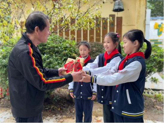 随后,孩子们手捧茶包,走到退休老教师面前,恭敬地送上节日祝福:“李老师,这是我们做的花茶包,愿您冬天喝了温暖常相伴!”老教师笑容满面,眼中满是幸福。小小茶包传递着温暖,师生之情在互动中静静流淌,敬老文化也在这一刻悄然传承。