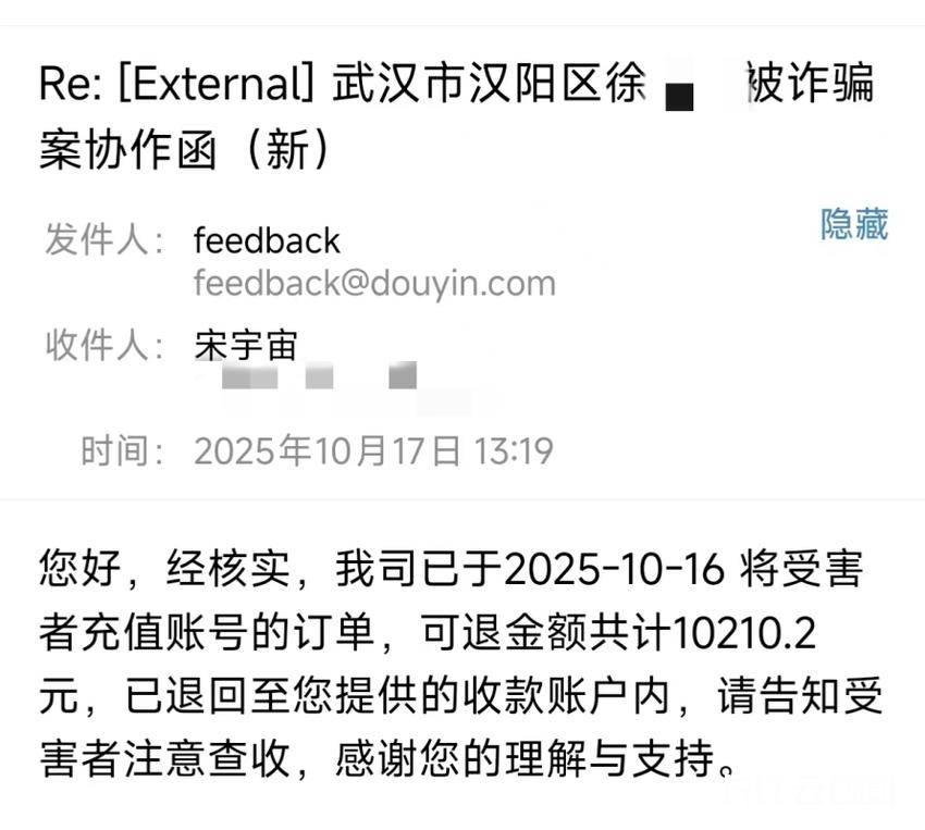 经过不懈努力,10月17日,民警终于收到了抖音公司的回复:徐先生被冻结的一万余元,已经成功返还到他的账户里了!
