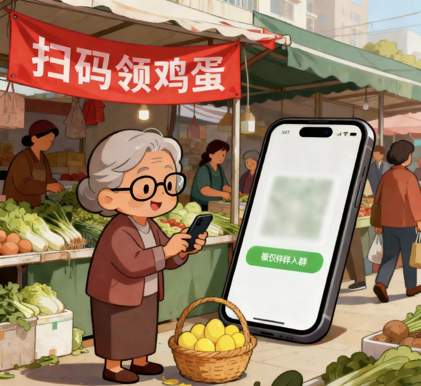 日益增长的银发群体消费需求,让不少人嗅到了老年群体私域直播的商机,而“扫码领鸡蛋”“答题领红包”这种低门槛、易触达的方式,便成为他们快速吸引老年用户、打开私域流量入口的常用策略。