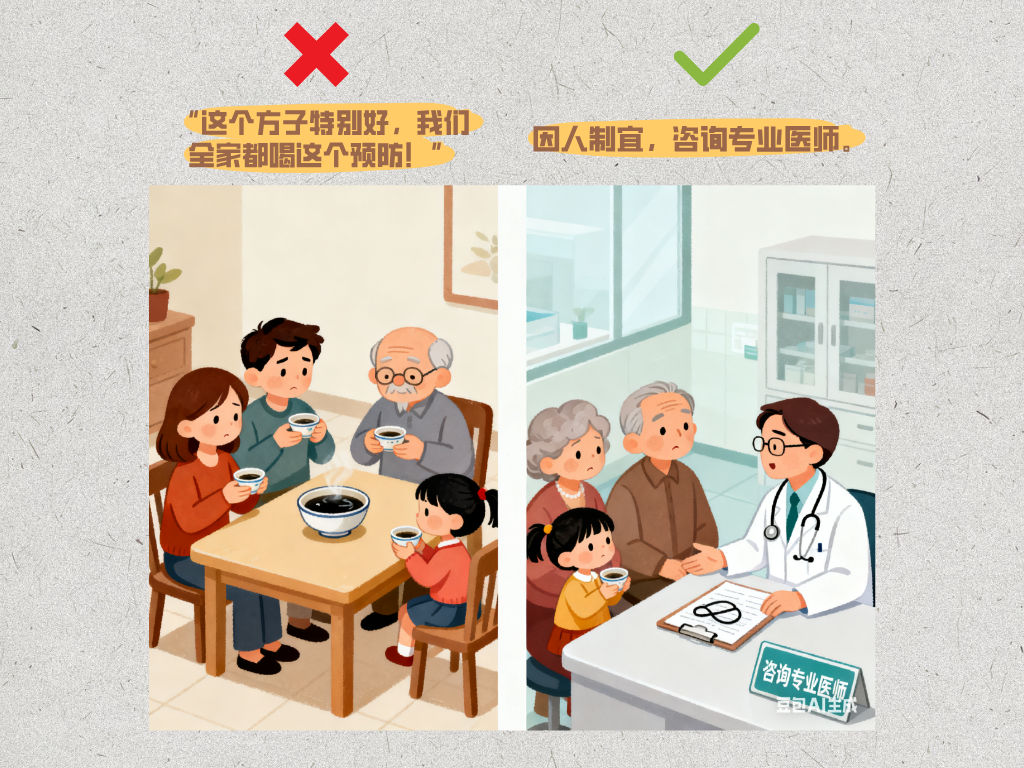 在采用任何中药方预防前,最好咨询一下专业中医师。同时,了解自己和家人的基本体质,日常食疗也可以分体质进行。