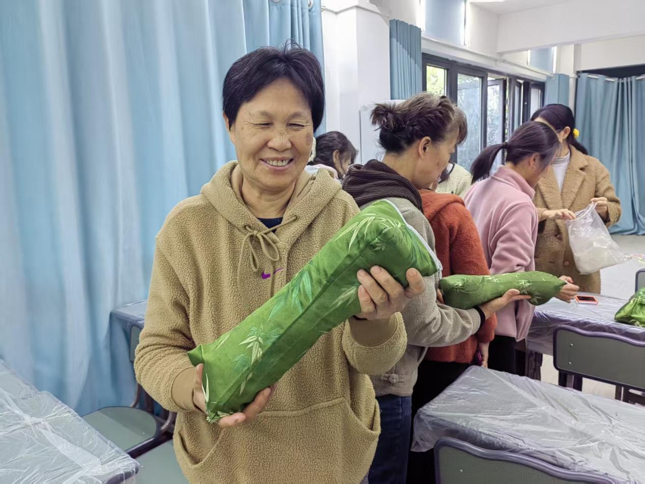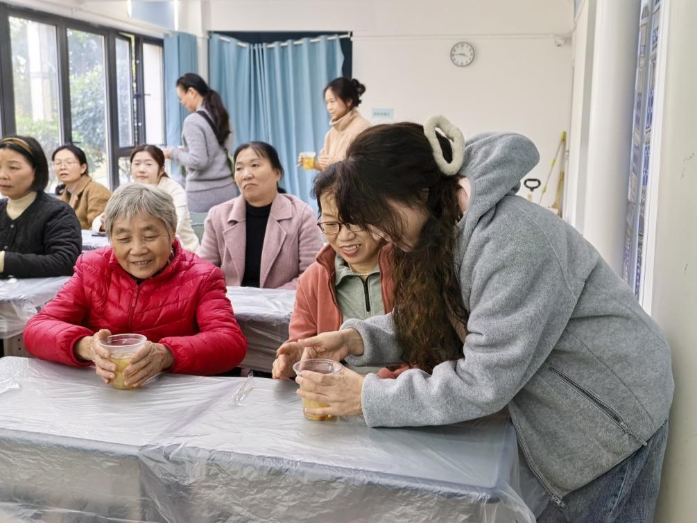 手作之余,一碗碗社区精心熬制的雪梨汤也温暖登场。居民们手捧温热的汤饮,交流着制作心得,分享着养生体验,现场氛围格外温馨融洽。一位居民感慨道:“自己做的枕头贴心,社区准备的梨汤暖心,这个下午真是太惬意了!”。