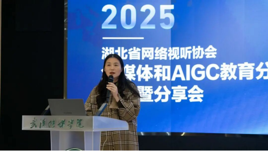 协会全媒体和AIGC教育分会会长、武汉传媒学院新闻传播学院院长赵倩主持会议,并围绕该校新闻传播专业的 AIGC 育人实践,分享了高校在技术变革时代的育人思路与探索。“我们要培养的,不是单纯的技术使用者,而是具备核心价值的创造者。”她明确指出,在AI 时代,人文素养的价值比以往任何时候都更为凸显。教育的核心任务,是帮助学生搭建技术能力与人文精神的深度对话桥梁,最终培养出能引领未来的复合型人才。“我们不仅要让学生带着 AI作品毕业、带着AI项目创业,更要让他们带着对技术伦理的敬畏之心步入社会。”