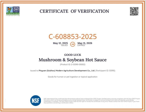 时间回到今年5月12日,这一天,对于品源公司意义非凡!一纸印有蝴蝶标志的证书跨越重洋抵达随州。品源公司菇的辣克GOODLUCK四款产品,成功通过全球最严苛的美国Non-GMO Project非转基因认证。10天后,在随州香菇产业高质量发展推介会上,品源公司和美国华人商会签下3亿美元意向订单。通过了美国非转基因认证的品源公司菇的辣克GOODLUCK辣酱,开始大批量走进美国本土商超大门。