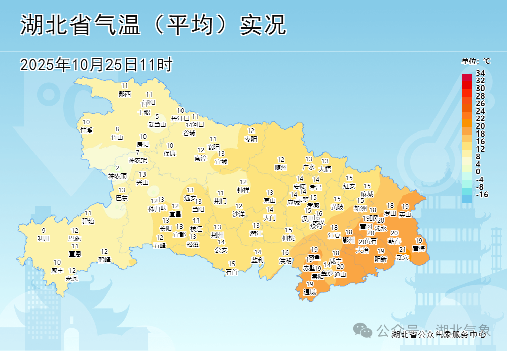 10月25日08时-26日08时,鄂西北、鄂西南、江汉平原、鄂东北西部小雨转多云;其他地区阴天到多云,局地有短时小雨。最高气温中西部12~15℃、东部15~21℃,最低气温中西部7~10℃、东部10~13℃,偏北风2到3级。