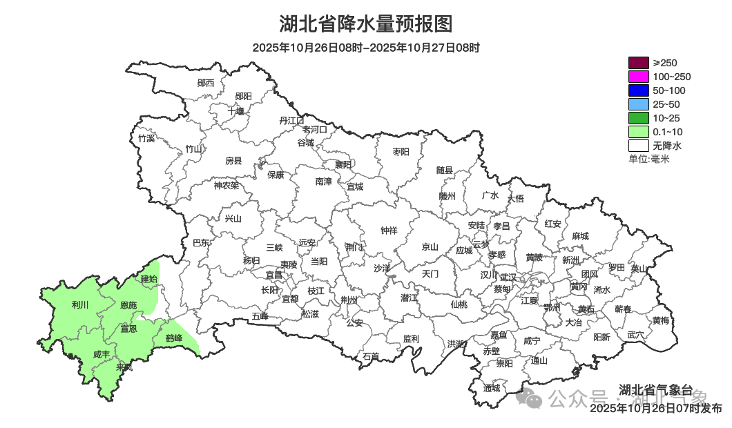 10月26日08时-27日08时,湖北全省多云,其中鄂西南局地有小雨。早晨省内中西部局地有雾。最高气温17~22℃,最低气温8~13℃,偏北风2到3级。