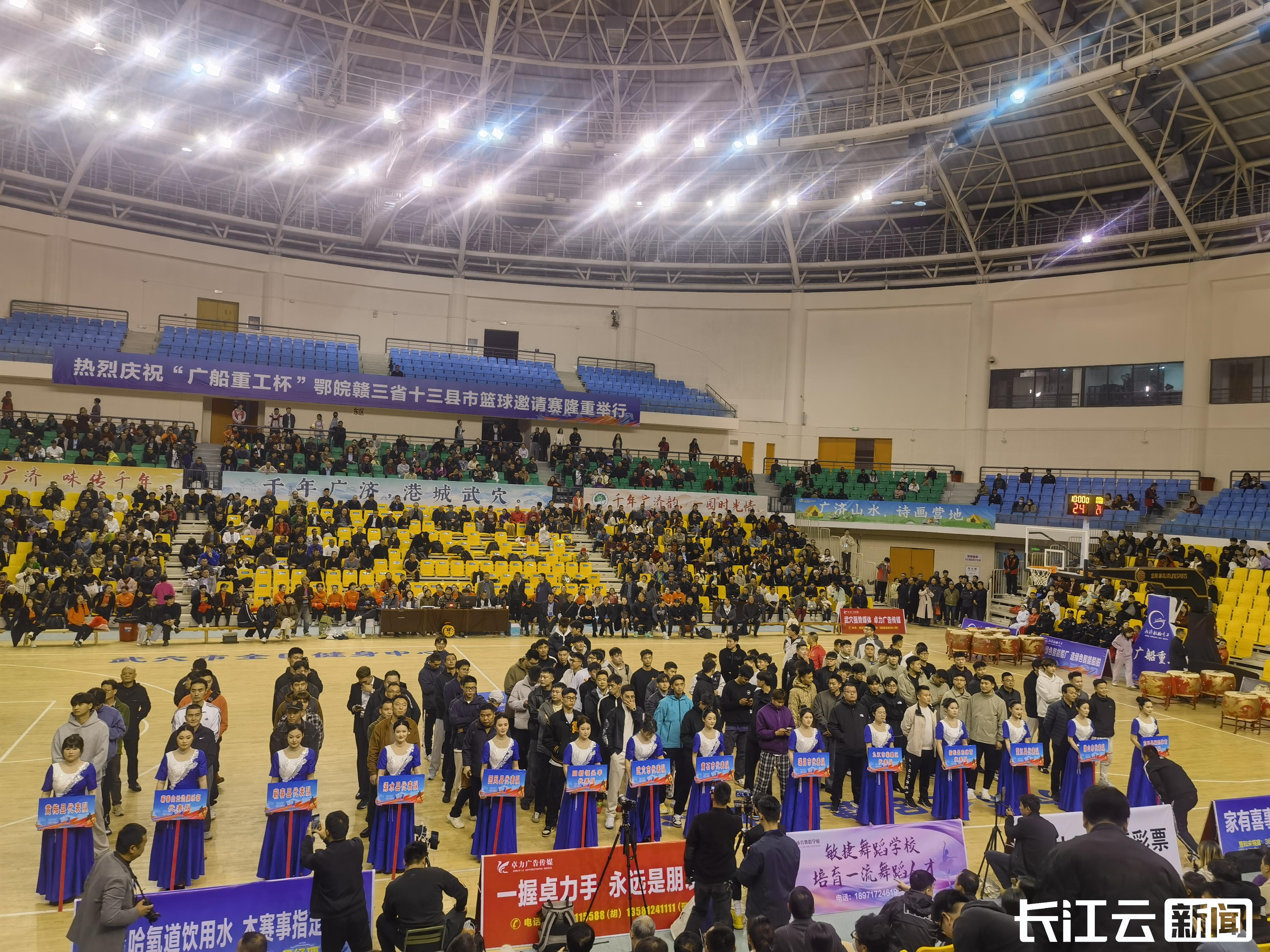 11月26日晚,“广船重工杯”鄂皖赣三省十三县(市、区)篮球邀请赛在湖北省武穴市全民健身中心体育馆激情开幕。来自湖北、安徽、江西三省的14支代表队、200多名篮球运动员和教练员齐聚一堂,将在为期8天的赛程中展开50场激烈角逐。