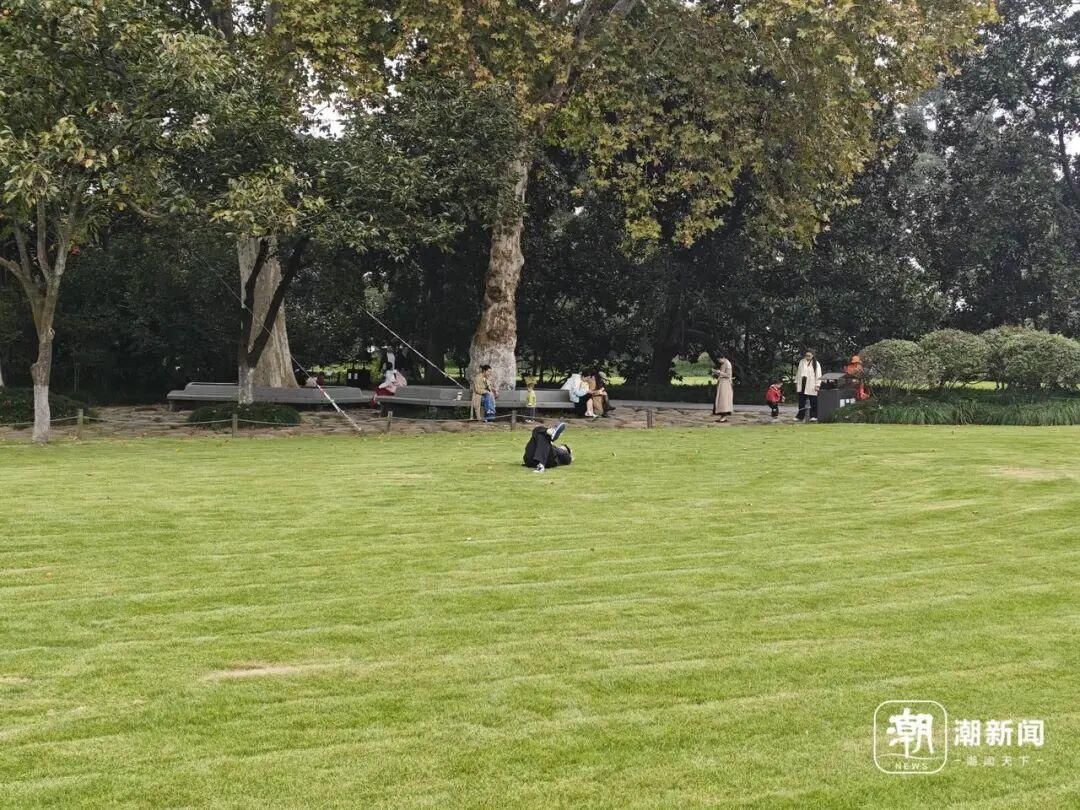 从花港观鱼景区沿着杨公堤往曲院风荷景区走,沿途有不少连片的大草坪,基本都有低矮的绳子围栏,不少游客在草坪上休憩、放空。