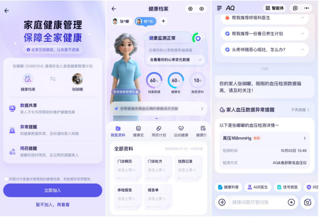 为帮助解决这些问题,围绕老年慢病健康管理,AQ推出了多项功能:拍一拍血压计、血糖仪即可智能解读数据,像医生能追问,并支持健康数据异常的即时预警;与鱼跃联合推出AI血压计,可自动同步数据并生成健康周报,便于血压长期管控;推出慢病用药提醒功能,父母和子女都会定时收到通知,减少忘吃漏吃,避免病情反复;支持健康档案共享给家人,父母的病历和体检报告,子女随时能看、能管、能提醒…通过技术让子女即使身处异地,也能为父母的健康筑起“防护网”,让重阳节的关怀不止于节日,更融入日常慢病管理的每一个细节。