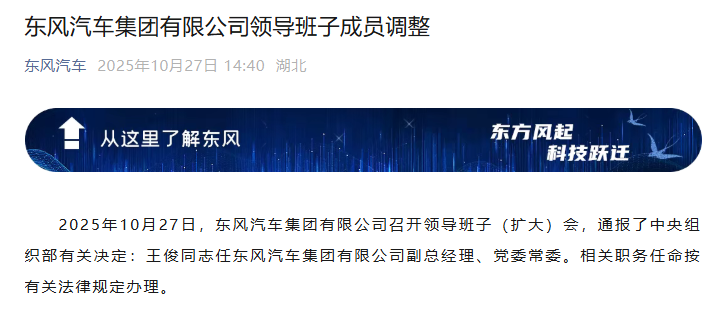 据“东风汽车”微信公众号10月27日消息,2025年10月27日,东风汽车集团有限公司召开领导班子(扩大)会,通报了中央组织部有关决定:王俊同志任东风汽车集团有限公司副总经理、党委常委。相关职务任命按有关法律规定办理。