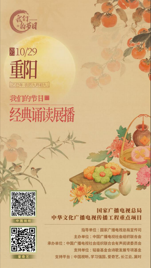 近日,由国家广播电视总局宣传司指导,中国广播电视社会组织联合会主办,中广联合会有声阅读委员会承办的“我们的节日经典诵读展播”重阳篇专题节目正式开播。节目以“鎏金岁月里的生命诗篇”为核心立意,通过名家诵读传情、民俗专家解读重阳习俗的方式,打造一场兼具文化深度与情感温度的重阳视听盛宴,让延续千年的重阳文化焕发新的生命力。