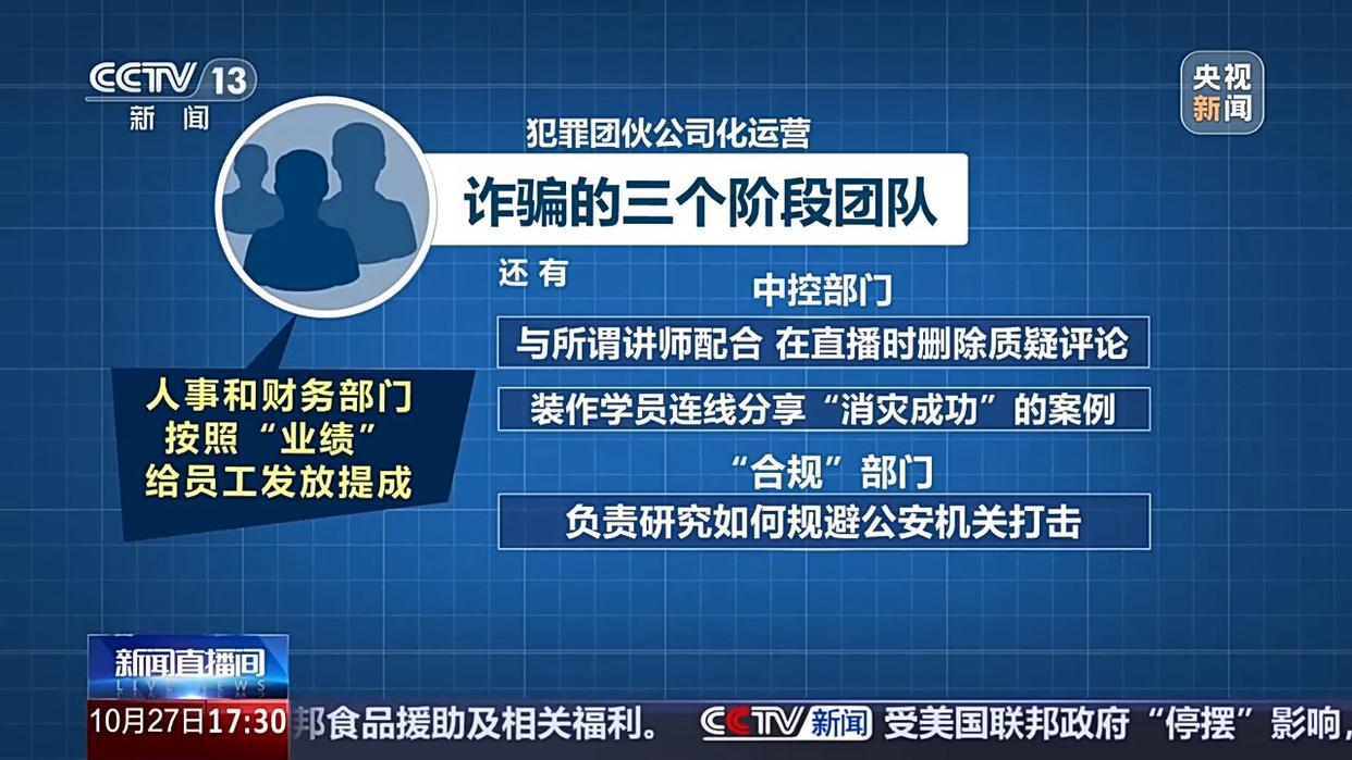 警方发现,犯罪团伙公司化运营,不仅有诈骗的三个阶段团队,还有中控部门与所谓讲师配合,在直播时删除质疑评论,或装作学员连线分享“消灾成功”的案例。“合规”部门负责研究如何规避公安机关打击,人事和财务部门则按照“业绩”给员工发放提成。