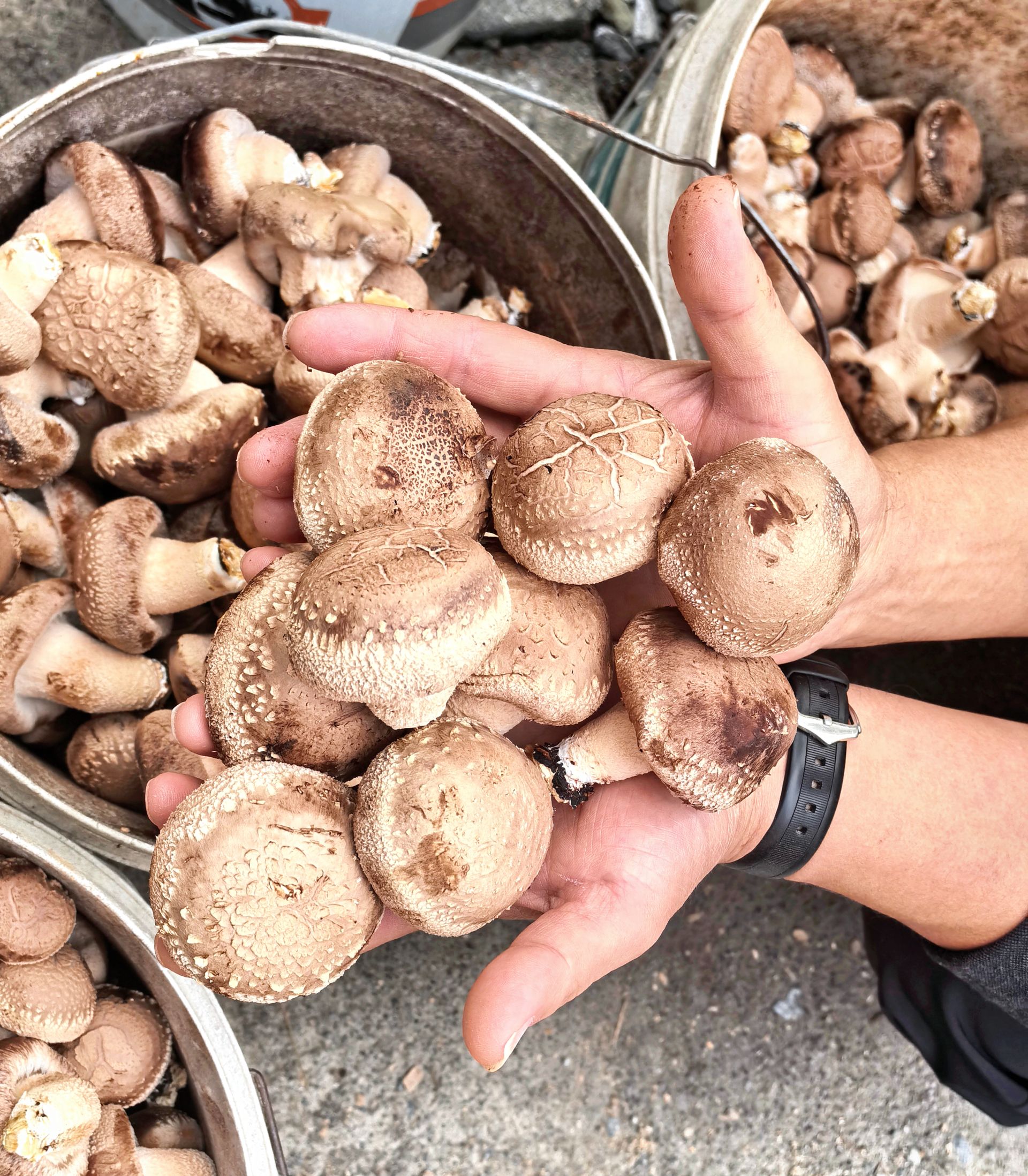 眼下,合作社的香菇已正式进入采摘季,一桶接一桶的新鲜香菇从棚内运出,一派忙碌又喜庆的丰收景象。“我们的香菇有四轮甚至五轮生长期,现在正是头茬菇的采摘期。这轮结束后,要根据菌袋养分情况停养10到15天,补足水分后再进入下一轮生长。香菇采摘季可持续到明年五月份。”刘诚介绍:整个生长周期都需要专人紧密监测,人手一刻也不能断。