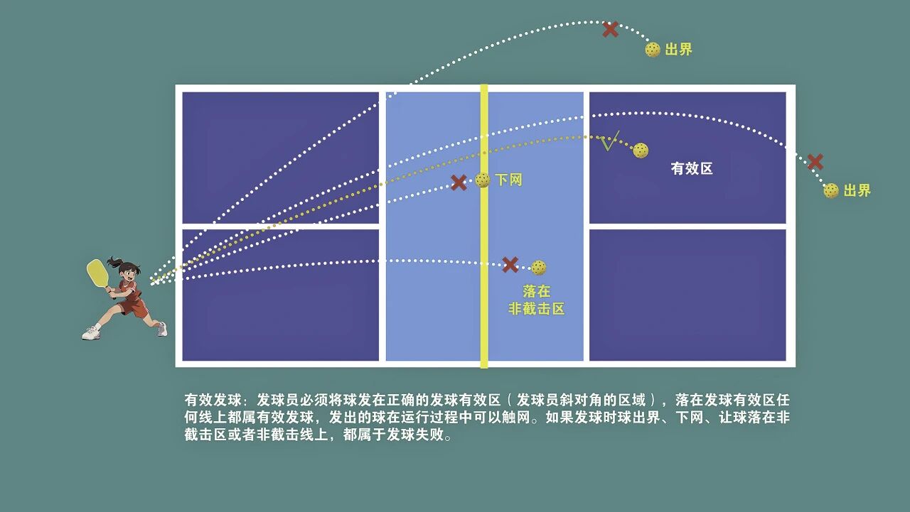 发球时,球员必须站在底线后的指定区域内,球需越过中线,发至对方发球有效区内。厨房区(非截击区)位于网前2.13米内的区域,球员在这个区域内禁止凌空截击。推荐新手采用凌空发球,发球时球拍拍头高度低于手腕,且以向上的轨迹击球,击球点在腰部以下位置。球要发到对方对角发球区,若发球触网后落在对方正确的发球区,则比赛继续,无需重新发球。发球时球不能落在厨房区(非截击区)。球发出落地反弹一次后,接球方需要等球再弹一次才能击打。从第三拍起,双方球员可以自由选择让球落地后击球,或者直接凌空击球。
