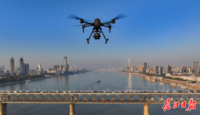 普宙科技无人机在武汉长江大桥上空往上、下游方向进行测绘、巡检。 长江日报记者胡冬冬 摄
