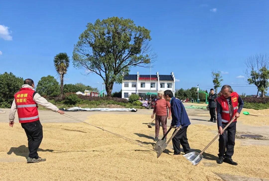 她口中的“帮忙”,正是周巷镇推进党建引领基层治理的缩影。在黄庙村村委会门前,村“两委”干部、周边村民与正在巡逻的“湾组长”自发组成“助农晒谷队”。满头银发的老人动作娴熟地挥铲,身着红马甲的志愿者热情投入,现场井然有序中透着浓浓的温情。