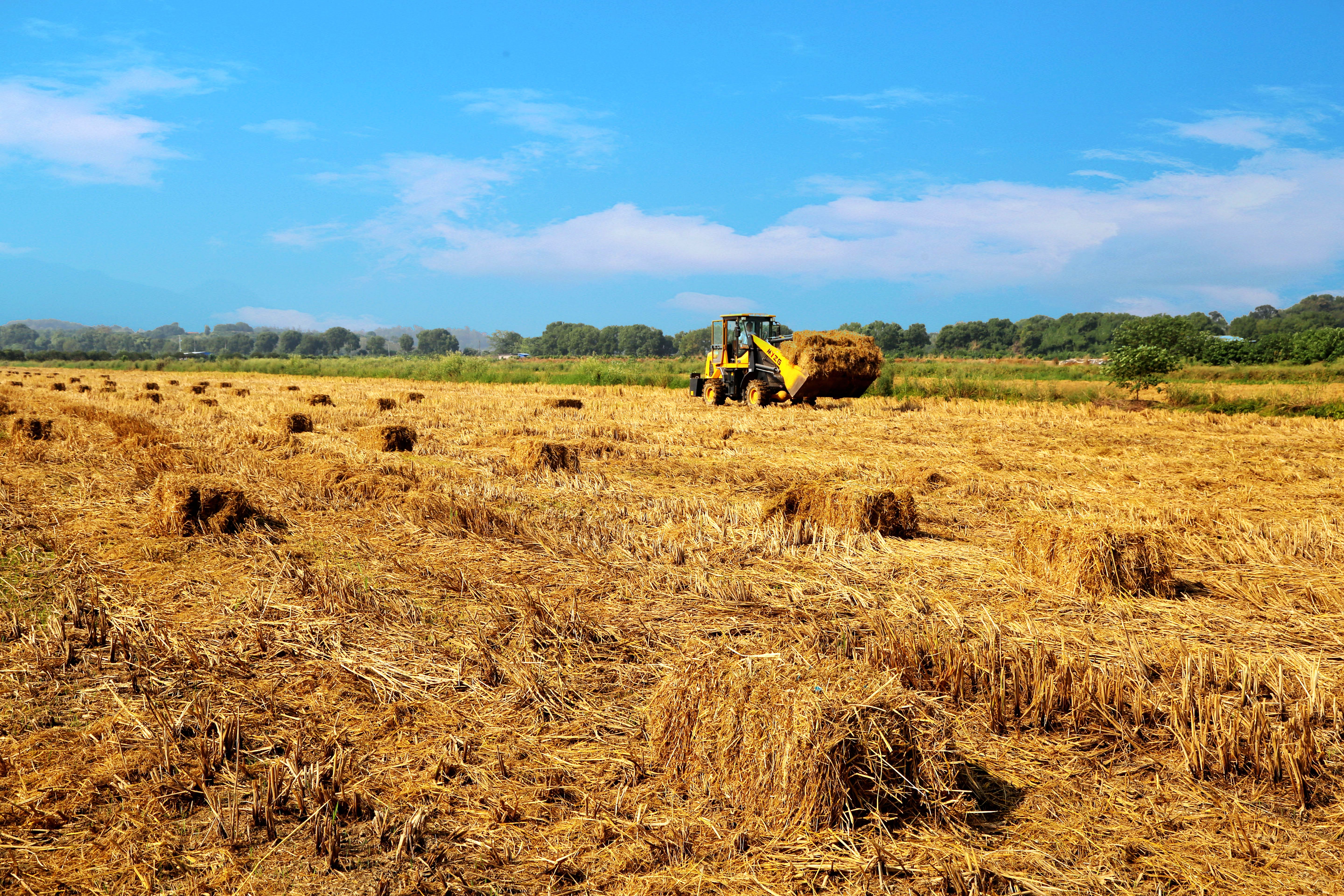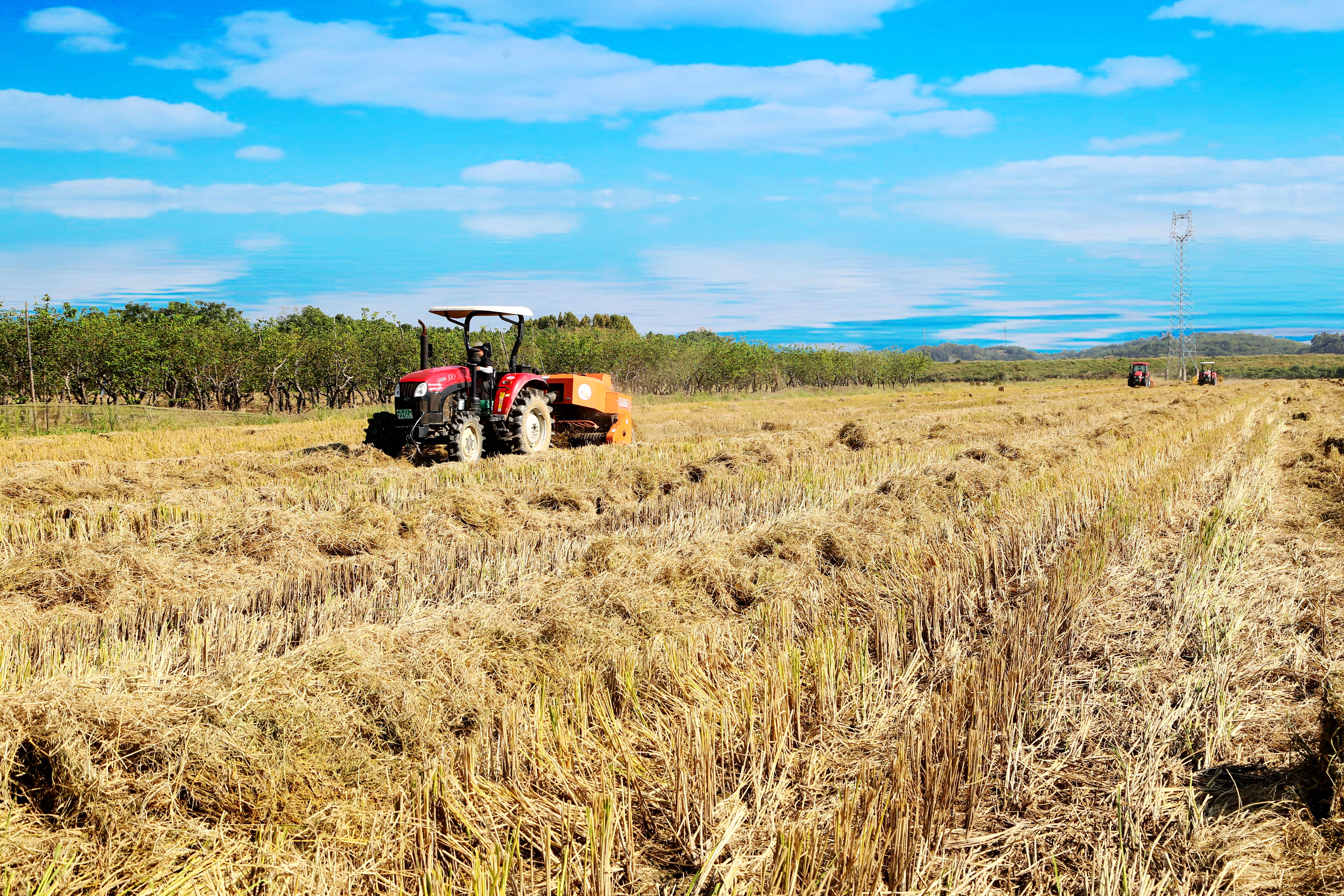 10月26日,黄石市阳新县率洲管理区的稻田里,水稻收割后的金黄稻茬间不见半分秸秆堆积。循着阵阵轰鸣,几台橙黄色打捆机正灵活穿梭,散落的水稻秸秆被“咕咚”吸入机身,转瞬便从尾部“吐”出方方正正的草捆,整齐码在田埂边。合作社理事长明瑞良蹲在田垄上,一手扶着机器护栏,一手接起客户电话,声音透着十足的底气:“放心,这批秸秆干度够、捆得实,今天就能装车送过去!”